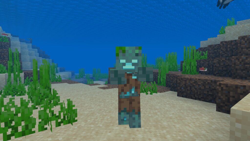 また、水中にはドラウンドという敵がMobがいます。トライデント持ちは強力です。見つけたら速やかに逃げましょう。