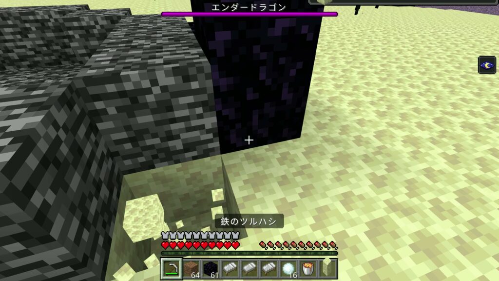 足場ブロックに登っているときに、エンダードラゴンが体当たりをしてくるのでエンダーパールや水バケツを使ってダメージを減らしていきましょう。