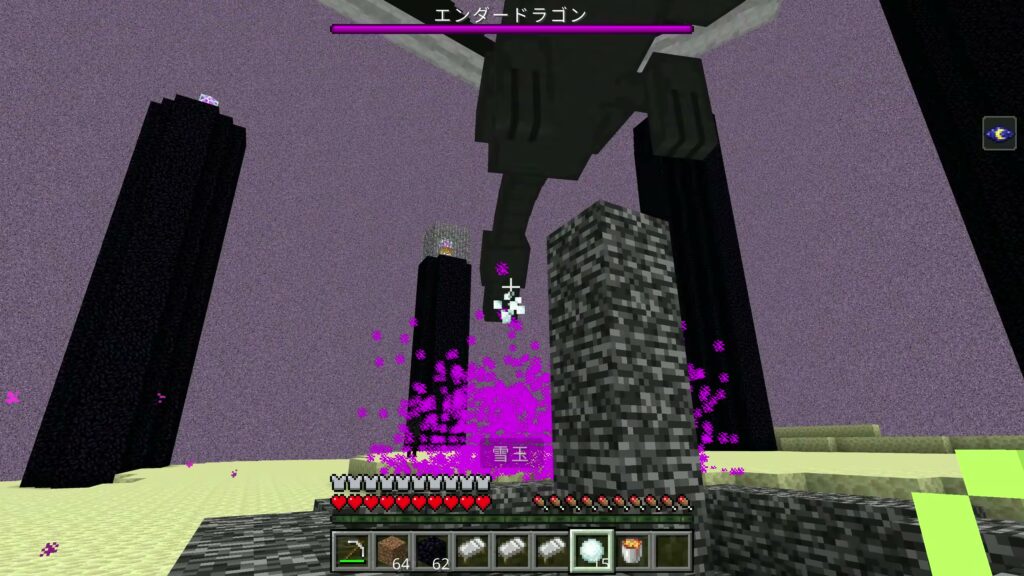 成功しやすいコツは雪玉をエンダードラゴンの頭の下から投げるのではなく後ろ側から投げることです。