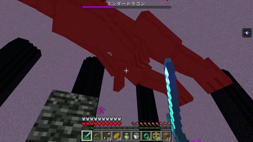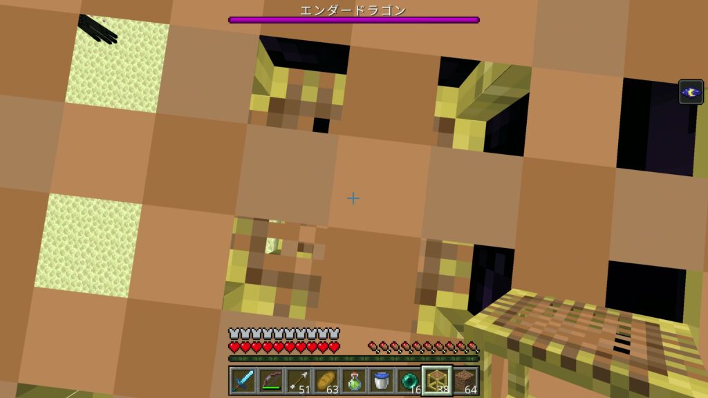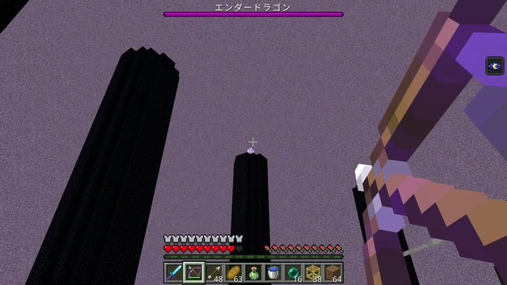 中央のポータルのところに来たら剣で攻撃し、離れて飛んでいたら弓を使ってエンダードラゴンの体力を減らしていきましょう。