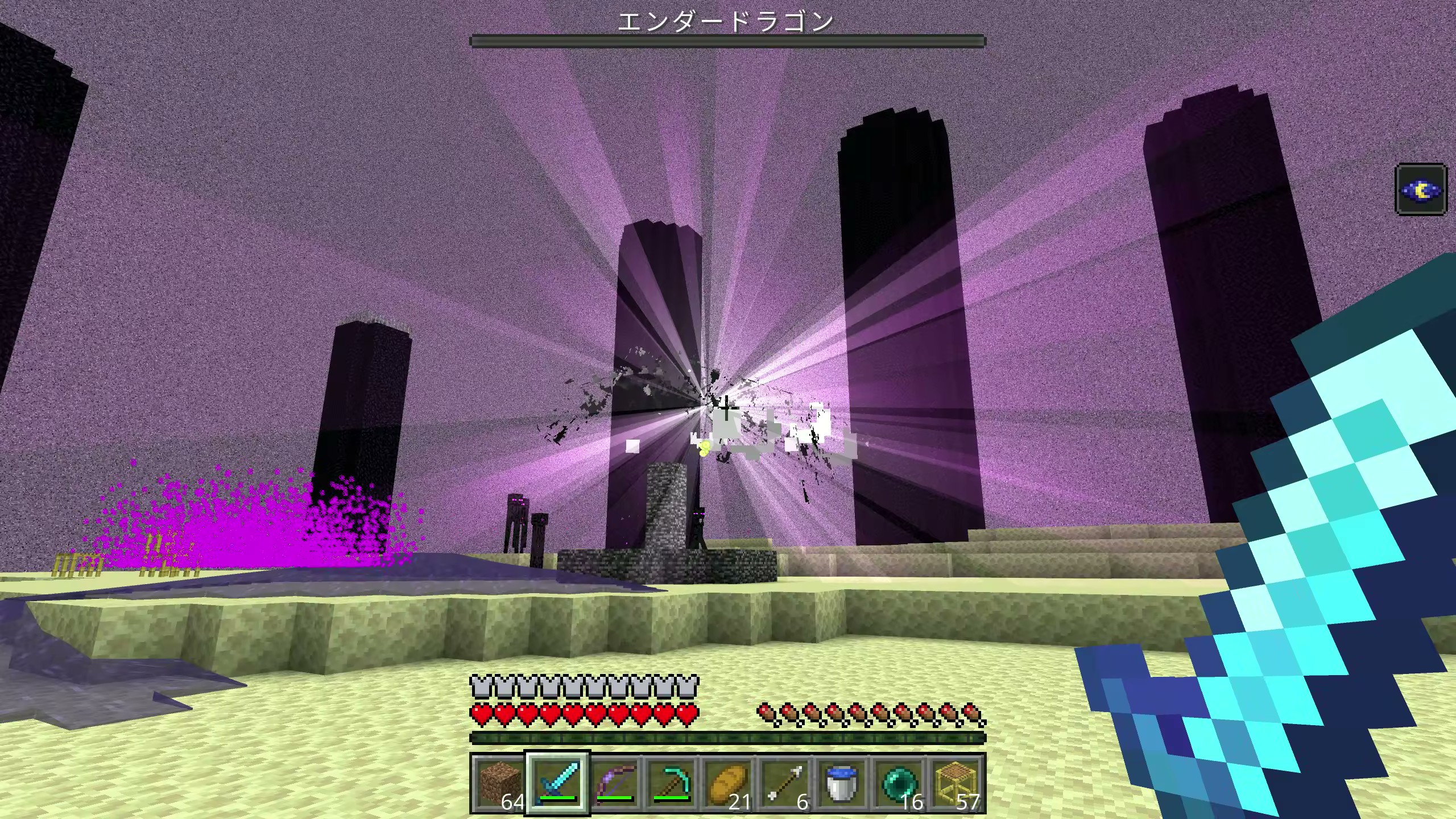 エンダードラゴンに攻撃する前にまずはエンドクリスタルを破壊していきましょう。