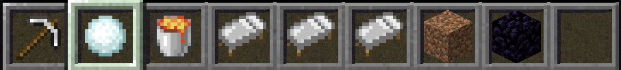 鉄のツルハシ、雪玉、溶岩バケツ、ベッド ×3、ブロック、黒曜石2個